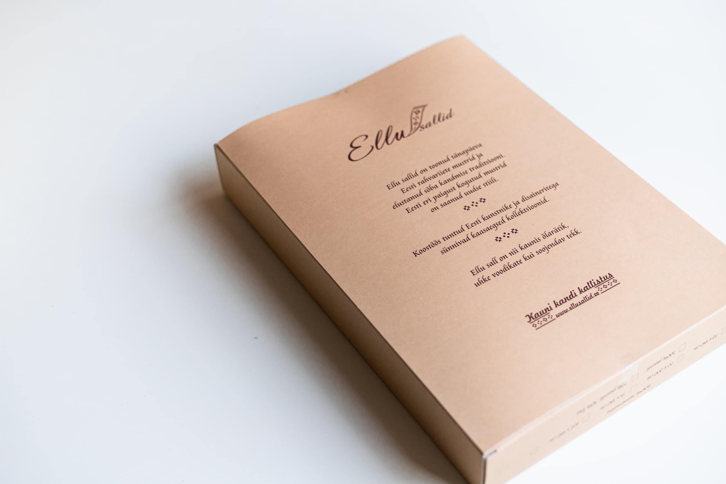 Ellu sallide kinkepakend kannab endaga salli lugu.Pakend annab hea võiamluse sall kingitusena kinkida. Pakend on tehtud spetsiaalselt nii, et see oleks loodust ja ühiskonda säästev. Pakendi on mõõtudes 330x300x80mm. Ja selle hind on 5€. Anna meile oma soovist teada, kui teed läbi e-poe tellimuse või soovid juba soetatud sallile pakendit.